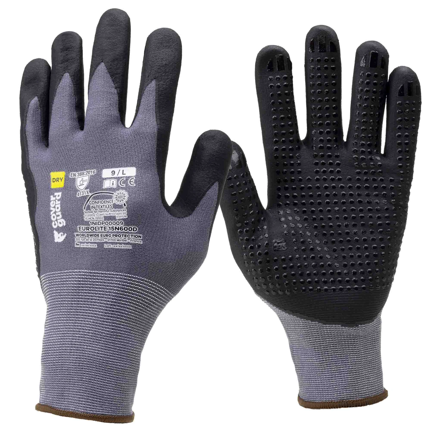Guanti Coverguard 1NIDP11 a base poliammidica grigia senza cuciture, finezza 15, spalmatura palmo in microschiuma di nitrile con punti sul palmo, polso in maglia certificata Oeko-tex standard 100.