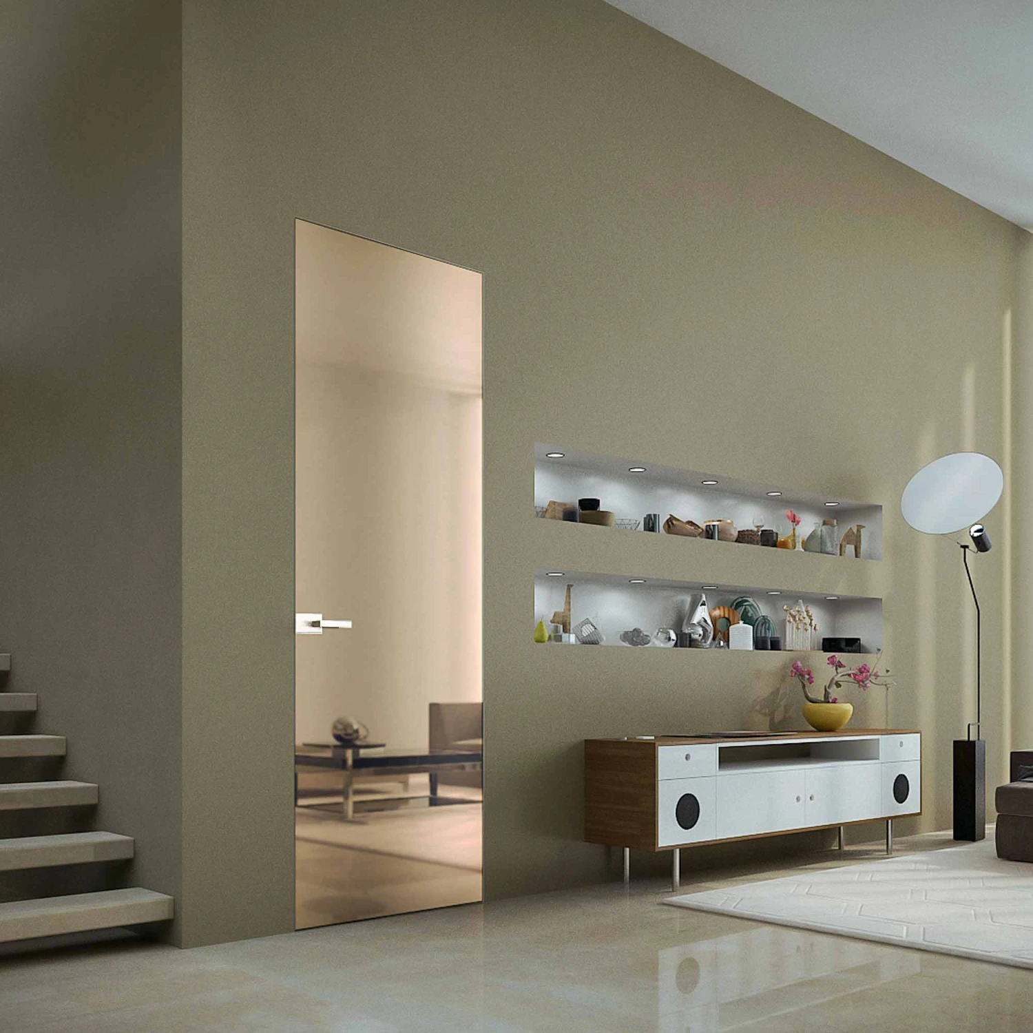 Il Telaio Scrigno Essential per Vetro Mirr è l’elemento chiave per creare porte battenti filomuro che si integrano perfettamente con l’ambiente circostante. Progettato per accogliere il pannello in vetro della serie Mirr, questo telaio elimina la necessità di cornici coprifilo, permettendo alla porta di “fondersi” completamente con il muro. Il risultato è una continuità visiva tra le pareti, che diventano protagoniste dello spazio, mentre la porta si percepisce come parte integrante dell’ambiente.